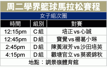 【本報訊】經過三日小休,全港學界籃球馬拉松周二假調景嶺體育館重燃戰火,被編入女子D組的種籽球隊寶覺中學及裘錦秋中學(葵涌),亦會在次圈相繼登場。