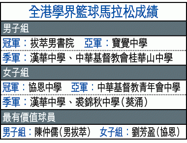 【全港學界籃球馬拉松】全港學界籃球馬拉松上周六假荃灣體育館上演決賽日,拔萃男書院和協恩中學笑到最後。男拔萃在男子組決賽挫寶覺,今季四入決賽首度封王;協恩則於女子組決賽輕取中華基督教青年會中學,連續六年成四冠后。