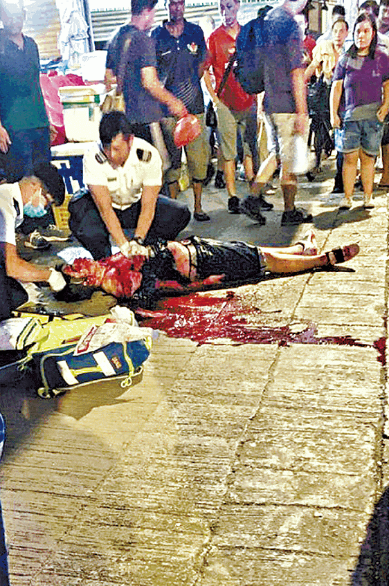 黃負傷落街奔走逾20米,至合益廣場地下一間菜檔對開不支倒地昏迷不醒,街坊見發生斬人案報警求助。警員及救護員接報到場,救護員即場替黃做心外壓急救。