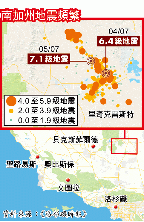 【兩日兩震】美國南加州兩日兩強震,上周四早上的6.4級地震原來是前震,「戲肉」翌日才登場:前晚同一地區再發生黎克特制7.1級強震,威力較前震強11倍,造成公路下陷、樓宇現裂縫甚至倒塌,幸而數名傷者傷勢都不嚴重。地震學家警告說,近日再發生6級以上地震的機率高達5成。