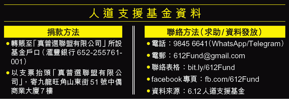 昨投入運作的6.12基金前身為「反送中受傷被捕者人道支援基金」,於6月16日民陣遊行期間,透過各大政黨和組織籌得共12,085,488元。基金已委託真普選聯盟,以其銀行戶口保管和存放捐款,核數師會定期公佈收支及跟進個案數字。