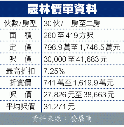 福晟國際本港首個項目何文田「奇則盤」晟林,昨日公佈首張價單,推出30伙,涉及6伙一房、24伙兩房,實用面積260至419方呎,提供最高折扣7.25%,折實741萬至1,619.9萬元,呎價27,826至38,661元,平均呎價高達31,271元。集團投資總監張楠形容,是批價格是「開心價」,以較保守姿態推出,欲予市場驚喜,項目最快下周開售,即日起開始收票。