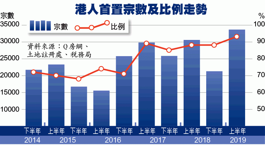 Q房網香港數據研究中心根據土地註冊處及稅務局資料指,上半年整體住宅註冊量較去年下半年的24,166宗大升五成至36,110宗,當中更創開始徵收雙倍印花稅(DSD)以來新高。需要繳付樓價15%雙倍印花稅的個案卻逆市下跌,由去年下半年的2,857宗跌至2,479宗。即是上半年港人首置宗數高達33,631宗,佔整體住宅買賣比例,由2017年以來的88%左右,上升至93%,創紀錄新高。Q房網陳坤興指,港人首置比例高,反映上半年入市買家以用家為主,樓市實質需求強勁。