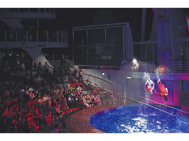 7天的行程中,只有兩天是全日在海上航行。記者認為,若要玩盡船上所有設施,莫說兩天,即使是7天也不太足夠。現時「海洋交響號」是世界上最大郵輪,造價達15億美元(約117億港元),總載客量6,680人,客房數目為2,759間;船上合共16層客用甲板,全長362米,寬65.7米。員工來自51個國家,團隊超過2,200人。在郵輪之旅,水上活動是基本,如嬉水池、甲板沖浪及高速滑水梯等。此外,體能運動設施亦不可少,如跑步徑、攀石牆、籃球場、健身室等。由於靠岸日子的船上人流較少,記者建議,如果當天落地行程不合心意,留在船上消遣是不錯之選。晚上也有各類型表演,如音樂劇、歌舞劇及雜技等。