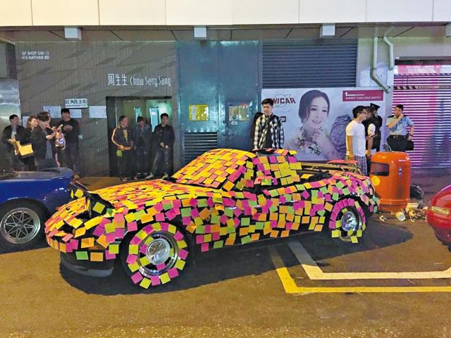 新砌起的牆,有些在行人隧道,有些在欄杆,一個汽車資訊網站更把一輛Mazda MX-5貼滿心意貼,變身流動連儂牆。