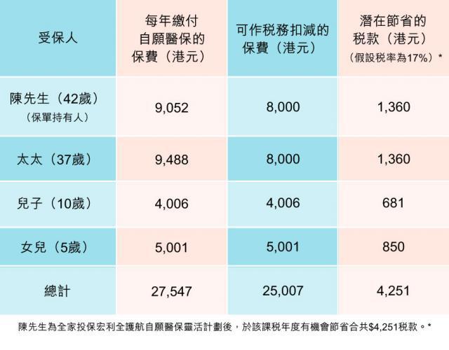 從陳先生的家庭收入及每月家庭保費的支出來看,他可以考慮以保單持有人身份為自己、太太及子女的醫保轉移至自願醫保,當中可選擇保障範圍較佳的靈活計劃,同時兼享稅務優惠。假設陳先生一家四口轉至自願醫保,並同時投保「宏利全護航自願醫保靈活計劃」,選擇半私家房連同高額醫療保障,預計年繳保費總共為$27,547,而一家人的可作稅務扣減的保費便是$25,007(見表),陳先生一年有機會節省合共$4,251的稅款。