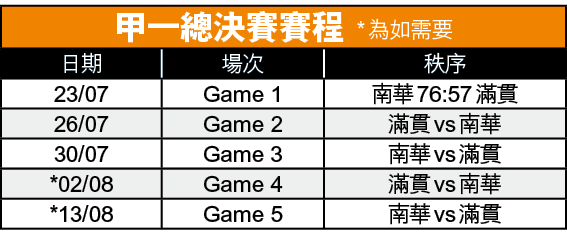 【甲一籃球總決賽】甲一總決賽第一場周二晚假新伊館開戰,滿貫缺少主力費格遜難敵南華,最終南華憑蔡再懃射入全場最高的24分,以76:57報捷,5場3勝制下先拔頭籌;季軍戰方面,永倫有泰那狂轟61分,以105:100挫東方。