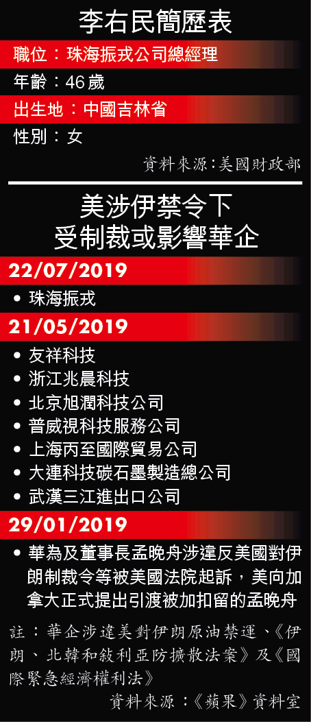 【中美貿易戰】中國科技巨企華為被指涉違反美國對伊朗禁令,今年初被美國法院起訴後,內地能源央企,珠海振戎公司亦被指涉違反美國對伊朗原油的禁購令,受美國制裁,珠海振戎總經理李右民亦被列入黑名單。中方昨嚴辭反對美國的制裁,促請美方糾正錯誤。