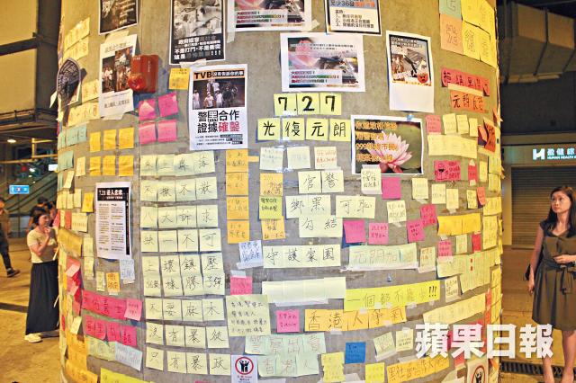 昨傍晚約6時,十多名青年於元朗西鐵站G出口附近自製連儂牆,先將「元朗連儂牆」標顯貼於巴士站附近一條石柱,下方則有「727光復元朗」、「警黑合作無間」等標語。由於連儂牆位於西鐵站出入口附近,多名市民下班途經上址時,均自發寫上打氣字句。