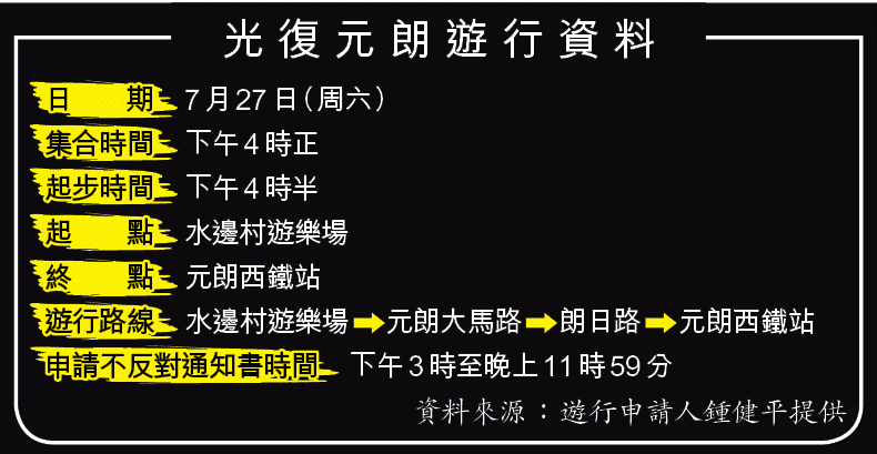 鍾健平見警方後表示,遊行後會在元朗西鐵站舉行集會,申請不反對通知書時間至晚上11時59分,警方對遊行路線較緊張,主要關注涉及輕鐵路軌的路段,具體安排要待今天再與警方、運輸署和港鐵開會後確認。