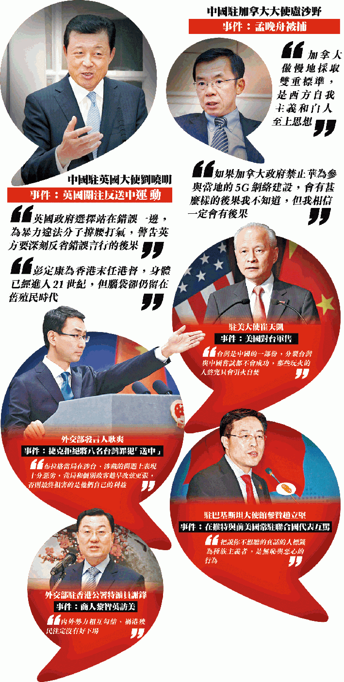 劉曉明2010年上任,過往少有露面,中英兩國關係今年6月前不算惡劣,英國首相文翠珊今年2月才訪華,但劉6月起多次接受外媒專訪,高談闊論。他率先透露中央無「指示」特區政府修訂《逃犯條例》,意圖「割席」,其後更把英國政界統統狠罵一頓,斥英國外相侯俊偉「選擇站在錯誤一邊,干預香港事務,為暴力違法分子撐腰」;斥末代港督彭定康「身體已經進入21世紀,但腦袋卻仍留在舊殖民時代」。連一些不太關英國事情的議題,如新疆「再教育營」及全國監控系統,他都高調回應。不止劉曉明,連前中國駐英大使馬振崗都出來撥火,指侯俊偉亂講,只為「撈選票」。