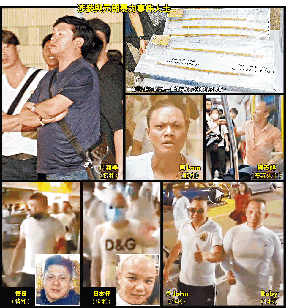 至於前日被捕的六名男子,其中三人屬和勝和,分別是跟隨「高佬安」姓李男子(49歲)、追隨坐館級人物「雙鷹清」搵食的姓張男子(50歲),以及綽號「咸魚」姓王男子(24歲),另一姓陳男子(34歲)則有黑幫14K背景。其餘兩男子姓陳(45歲)及姓黃(45歲)則無黑社會背景,他們分別住在元朗及天水圍。另外,涉嫌於當日在西鐵元朗站拳打腳踢立場新聞女記者的男子,事後被網民迅速起底,指其是在元朗開設農莊的陳志祥。