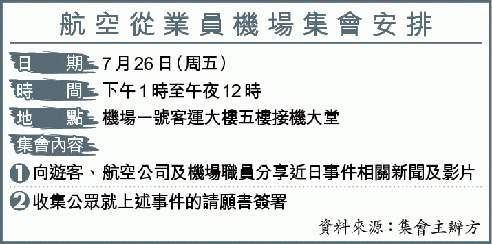 集會將於後日下午1時在機場一號客運大樓五樓接機大堂舉行,並呼籲機場員工參與。發起人包括航空公司辦公室職員及機場員工,預計至少有500人出席。集會期間,參與者將向遊客、航空公司及機場職員播放近日事件相關新聞及影片,並收集公眾簽名製成請願書。發起人表示,集會非罷工及癱瘓機場,現已委託空總為集會申請不反對通知書,但強調集會不設「大台」,空總只會協助處理行政程序。