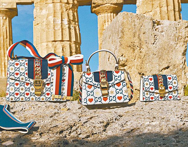 Gucci同樣以心形圖案為設計主軸,系列配合代表對愛情堅定守護的六芒星圖騰,融入雙G logo的白底印花,並以經典的藍紅織帶點綴,華麗中不失可愛感。紙袋和包裝都別出心裁,同樣以金色的愛心和六芒星印花填滿,幸福滿溢。