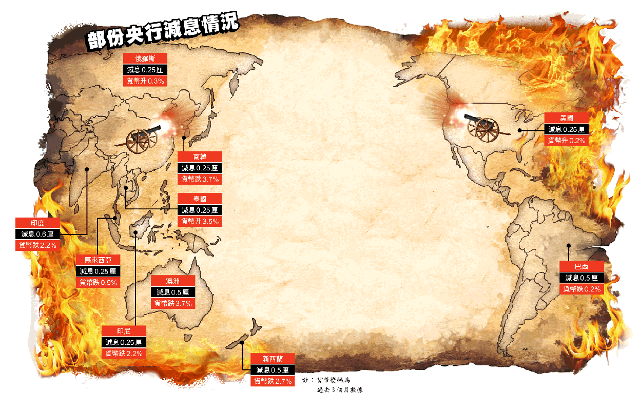 【本報訊】人民幣周一跌穿7算,泰國、印度和新西蘭隨即出手,在昨天同日宣佈減息,讓市場意外。統計過去3個月已有20個國家減息,觸發區內部份滙價骨牌貶值。有經濟師指,若有國家想以貶值增出口競爭力,在此形勢下大幅打折。專家分析,環球息率低企,貨幣寬鬆功效大減,全球面臨08年金融海嘯或97年亞洲金融風暴後更大危機。
