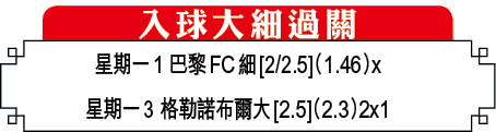 同日另一場,巴黎FC迎戰中游分子查貝利。前者剛於法聯盃戰至互射12碼險勝GFCO阿些斯奧晉級,聯賽戰績甚差,開季5戰尚未開齋僅僅入2球;對手查貝利至今仍不敗,但入球能力頗弱,開季首兩輪皆小勝1:0,近三輪連續悶和0:0,「入球大細」中位數開[2/2.5球],「細」僅得1.46倍勝在夠穩,屬過關穩膽不二之選。