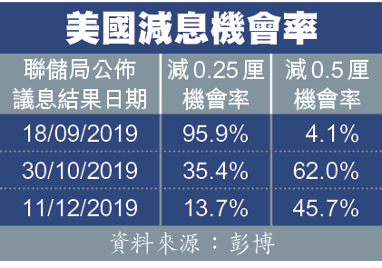 【本報綜合報道】美國聯儲局主席鮑威爾上周五在瑞士蘇黎世發表講話,重申將採取適當措施維持經濟擴張,避免陷入衰退;但美國8月非農新增職位差過預期,投資者憧憬央行放水撐大市。聯邦基金利率期貨顯示,美國9月減息機會逾九成。