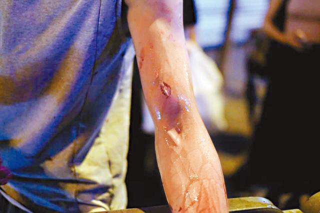 【本報訊】大批示威市民前晚在旺角一帶聚集至昨日凌晨仍未散去,其間旺角及油麻地分別有襲擊案。一名藍衫中年漢手持呎長利器,在彌敦道打傷兩名市民後離去。港鐵油麻地站亦有一名光頭男子懷疑醉酒,在列車上打傷一男一女市民。混亂間光頭男跌倒受傷,事後涉嫌普通襲擊被捕,送院治理。