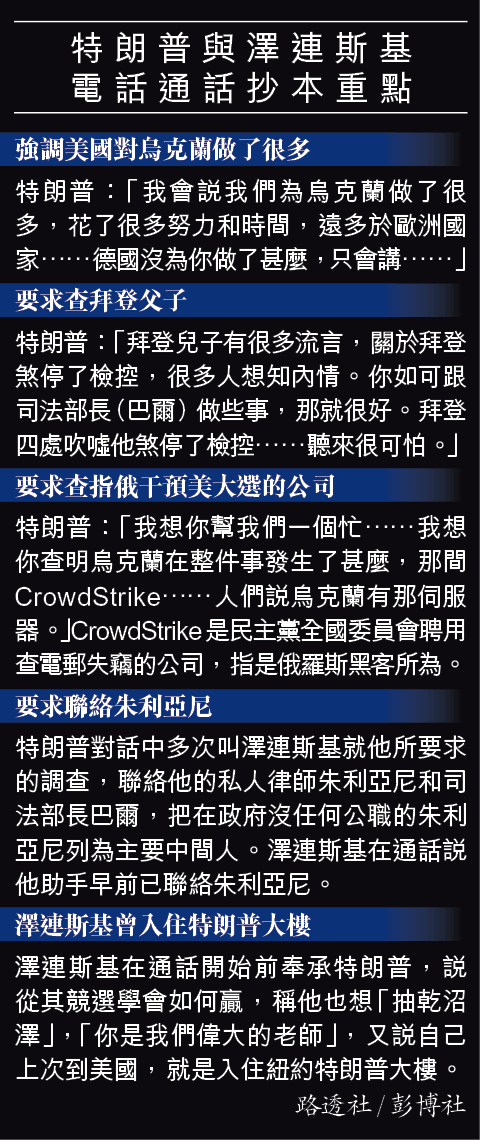 【通烏風波】美國民主黨對總統特朗普啟動彈劾調查,接連增添新彈藥。特朗普被指以扣起軍事援助作籌碼,施壓要烏克蘭總統澤連斯基代他挖黑材料,以打擊明年大選潛在對手拜登。白宮前天為拆彈,先公開兩人電話通話抄本,再讓國會議員閱讀並公開舉報特朗普的情報人員投訴書。民主黨人指投訴書內容令人「深感不安」,多了很多線索調查。