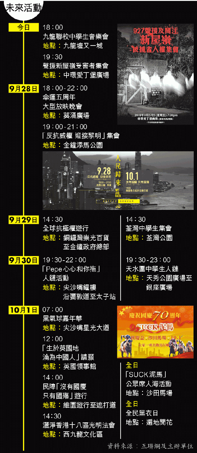 至於10.1當日,民陣正申請舉行「沒有國慶 只有國殤」遊行,同日亦有到英國領事館請願要求廢除《中英聯合聲明》,以及沙田馬場的「SUCK泥馬」公眾席人海活動,當日亦有全民黑衣日,呼籲公眾穿着黑衣,哀悼「國難」。