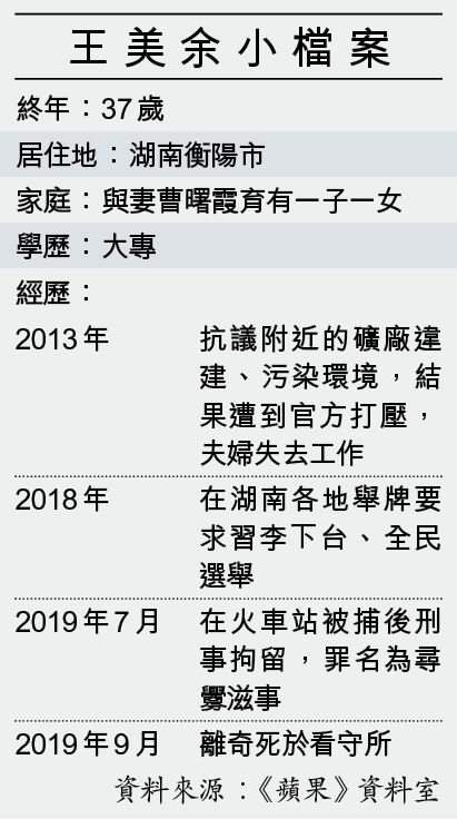 繼民運人士李旺陽七年前「被自殺」後,湖南再發生維權人士離奇死亡事件。曾舉牌要求國家主席習近平、國務院總理李克強下台的王美余,周一傳出在衡陽看守所中死亡。他的遺孀曹曙霞向《蘋果》哭訴當局將丈夫「整死」,指見到對方遺容面目全非,「耳朵、鼻子都流血,整個人變很瘦很黑,認不出他!」當地警方大為緊張,律師謝陽受委託前晚赴衡陽調查期間,隨即被控制超過15小時。