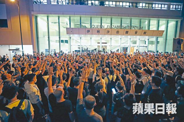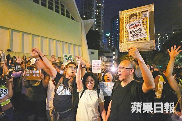【本報訊】林鄭月娥首場社區對話會和平完成,但場外氣氛一直緊張。近千名被對話會摒於門外的市民昨晚包圍伊館,齊聲高喊「五大訴求,缺一不可」等口號兩小時,希望將港人的聲音傳入場內。對話會完場後,群眾不肯離開,一度堵塞伊館前後門,要求林鄭出來面對群眾。