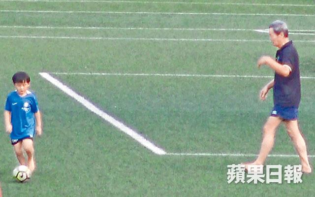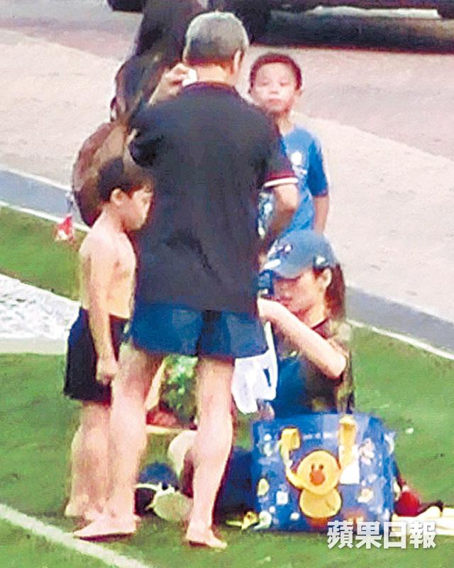 原來呂爸爸已經在場邊等候,身穿短波褲、polo恤的呂爸爸很有活力,和女兒談了幾句就除下波鞋,赤腳圍着場邊跑步,呂慧儀就坐在草地上繼續撳電話。場上有一班小朋友在接受足球訓練,Anton學習中途跑到媽咪身邊,母子說了幾句話,呂慧儀用手機為囝囝拍攝。