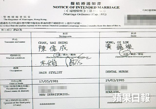 周秀娜日前現身活動時強調仍然單身,希望努力覓得真命天子,但佢嘅髮型師舊愛陳偉成(Avis)就宣佈封盤,今年6月底時成功向拍拖半年嘅model女友黃樂樂求婚,當時Avis仲話好想組織家庭。一對準新人早前已影咗一輯結婚相,計劃明年搞童話式婚禮。《蘋果》噚日發現佢哋已入紙申請註冊結婚,38歲準新郎Avis報稱做髮型師,而24歲準新娘原來真名叫黃藹樂,職業報稱係牙醫護士。