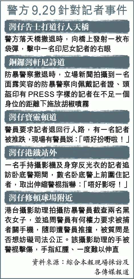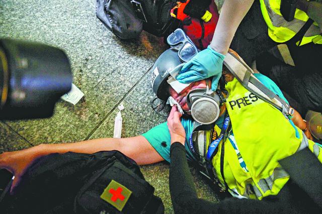 【本報訊】前日港島區多處爆發警民衝突,警方行動除針對示威者外,亦屢次阻礙記者合法採訪,甚至襲擊記者;有記者被警察近距離施放胡椒噴霧、被警棍打、被語言威嚇。一名本地印尼語媒體女記者遭警方的布袋彈射傷右眼,傷勢嚴重。記協及香港外國記者協會(FCC)譴責警方對合法採訪的記者施以暴力。受傷印尼記者已決定提出刑事投訴及民事訴訟,警方拒絕評論該記者傷勢成因,辯稱不會刻意瞄準記者射擊。