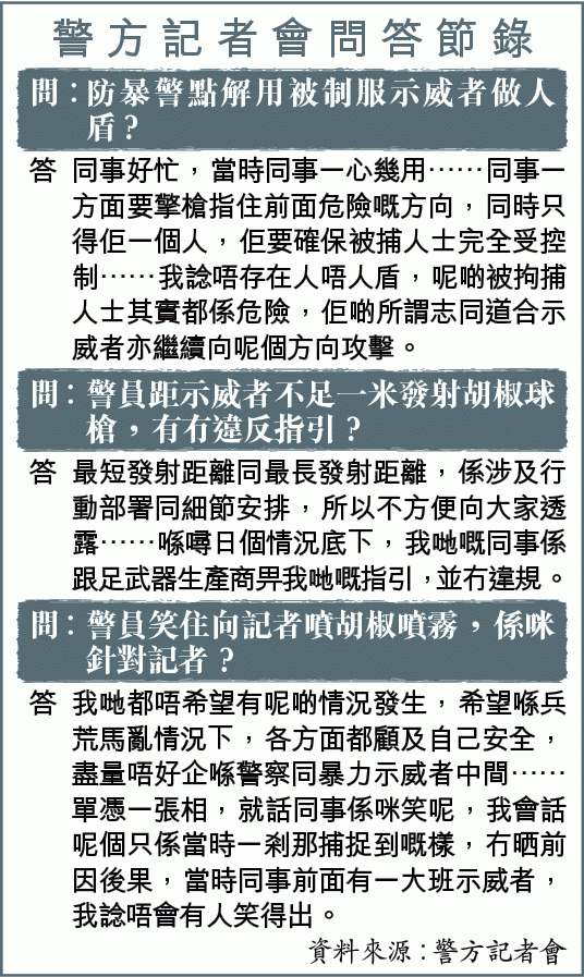 在昨日的警方例行記者會上,警察公共關係科總警司謝振中承認有警員曾在樓梯向橋上發射一發布袋彈,辯稱是由於當時橋上有大量示威者。他不評論女記者傷勢成因,但聲稱警方不會刻意瞄準記者射擊。