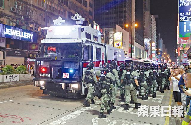 【本報訊】昨入夜後,市區多處均見抗爭者影蹤。在示威熱點旺角警署外,有人堵路及以雷射筆照向警署,警方一度出動水炮車。黃大仙亦有人堵路,最少三人被警方拘捕,再有懷疑喬裝成蒙面示威者的警員出沒。香港仔及將軍澳也有抗爭者破壞行動,有街坊不滿路過也被截查。