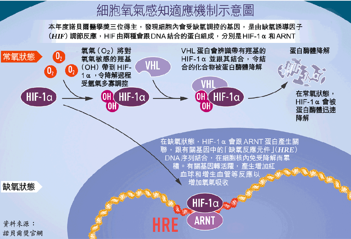 氧氣是生命必須元素,地球上所有動物都需要氧氣來將食物轉化成有用的能量。人類多個世紀前已知氧氣是重中之重,但細胞如何適應氧氣水平變化,卻很長時間是未解之謎。美英三位科學家發現細胞如何感知和適應不同氧氣水平的機制,亦開啟治療貧血和癌症等疾病新方法,奪得今年諾貝爾醫學獎。
