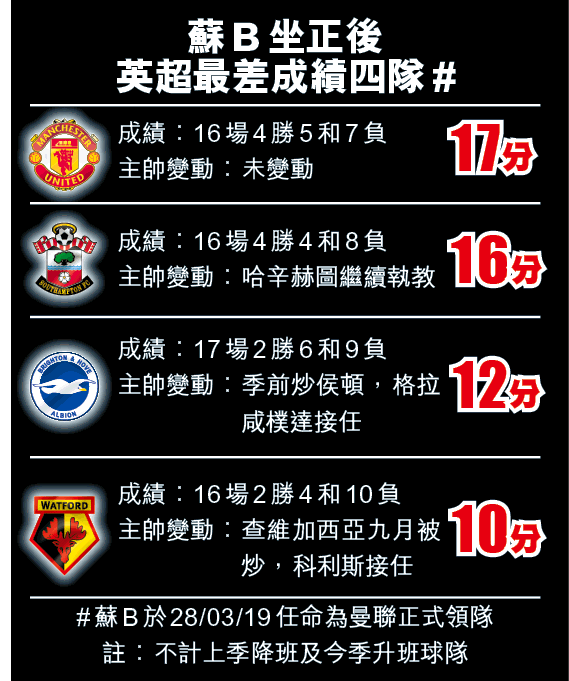曼聯敗陣後今季8戰僅得9分,創下自1989/90球季以來的最差同期成績。去年12月,曼聯作客利物浦完敗1:3,當時主帥摩連奴在賽後不久被球會辭退,蘇斯克查以臨時領隊身份接任,初期猶如一支強心針令曼聯極速回勇,曾帶隊於各項賽事作客九連勝,包括造訪巴黎王子球場以3:1淘汰巴黎聖日耳門的代表作,現在看來更似是迴光反照。到今年三月尾曼聯決定正式聘用蘇斯克查為主帥,球隊便以同樣的高速滑落。若由蘇B坐正起開始計算各支英超球隊到今輪聯賽的成績,曼聯16戰僅4勝5和7負得17分,撇開上季已降班的3支球隊與今季升班的3隊,同期只有修咸頓、白禮頓與屈福特的成績比紅魔差,足見蘇B領軍下曼聯的不濟。