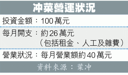 隨後兩年,葉冲先後在鯉景灣、西環、灣仔落腳,「兩年半前才考慮開舖,揀了尖沙嘴商廈一間西餐廳承包,佢哋有現成廚房,我只花兩、三萬元補充廚具,另花30幾萬申請牌照」。餐廳可容納40枱客,人均消費600多元,每月營業額約40多萬元。