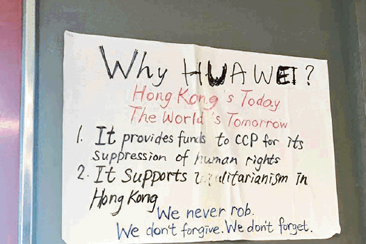 抗爭者離開前在店外貼上標題為「Why HUAWEI?」的英文文宣,指出「今日香港,明日世界」,思疑華為將利潤提供中共打壓人權,又指華為支持極權主義,但強調示威者不會打劫。
