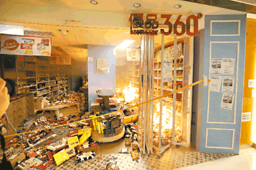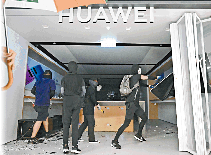 目擊巿民何先生稱,昨日下午4時許,逾10名黑衣人用棍輔以腳踢,打開華為體驗店電閘破壞,打翻店內桌椅和展架。事後現場玻璃碎片散落一地,最新旗艦手機產品P30 Pro的宣傳廣告箱被打爛,耳機、手提電話、智能手錶及手帶等多盒貨品被掃跌地上,但包裝完好無缺。牆上廣告的HUAWEI字樣被人以黑漆刪去,改成「iPhone」;店內亦有噴漆寫上「五大訴求 缺一不可」口號。