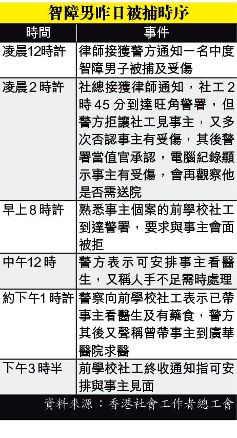 【本報訊】警方濫暴醜聞不斷,昨日更被指隱瞞中度智障被捕人士傷勢及拒讓社工接觸事主逾15小時。香港社會工作者總工會稱,昨日凌晨接獲律師通知,指一名中度智障男子被捕,後腦、肩膀和門牙受傷,被捕後十分驚恐,但社工凌晨趕至旺角警署,警方卻多次否認事主受傷,又拒讓社工接觸事主,至事主被捕逾15小時後,社工及律師始獲安排接見事主,社總狠批警方「講大話」,延誤其接受治療及法律支援機會,亦憂事主十多小時無社工協助,情緒嚴重受困。