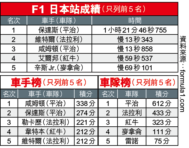 【F1 日本站】受颱風影響,F1日本站的排位賽及正賽被迫安排同在周日進行。縱使法拉利兩部戰車在排位賽包攬頭兩位出賽,但排第三位起步的平治車手保達斯卻在正賽一展開已越過兩人頭,最後也贏得個人今季第三個分站冠軍,最更重要是協助車隊連續六年成為總冠軍,追平法拉利車隊的紀錄。