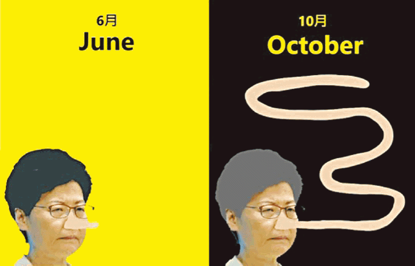 八方當然係真‧香港人,所以做咗測試,老實講啲圖唔係全部一睇就明,但越睇越欷歔,例如6月時香港人仲會着唔同色衫,但到10月全黑black bloc已經係指定服裝;之前只戴普通口罩,現時已升級到防毒面具;6月初明明只係要求撤回惡法,但今日已變咗六大訴求,新增埋解散警隊,口號亦由「香港人加油」變成「香港人反抗」;「自殺」個案亦較6月時大增,交通工具選擇上,就已經冇咗黨鐵了。至於壓軸一幅,係777個鼻本來已變長,家陣就長到打蛇餅,即係佢呢幾個月又講咗數之不盡嘅大話囉。