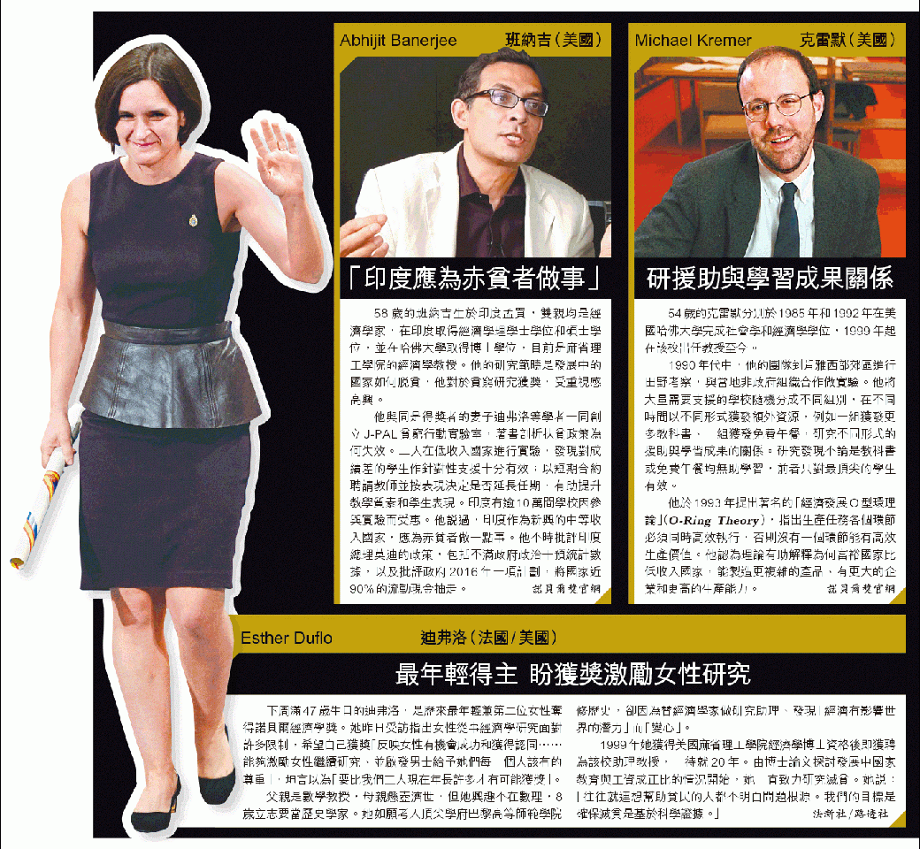 諾貝爾經濟學獎過往被評是白人男性天下,瑞典皇家科學院昨天宣佈的三位得主,可算略有改善得主單一化問題,其中法美雙重國籍的迪弗洛(Esther Duflo),是歷來第二位經濟學獎女得主,46歲得獎也是經濟學獎歷屆得主中最年輕。她的丈夫、美籍印度裔學者班納吉(Abhijit Banerjee)是歷來第三位非白人經濟獎得主。兩夫婦跟美國學者克雷默(Michael Kremer)將平分900萬瑞典克朗(714萬港元)獎金。