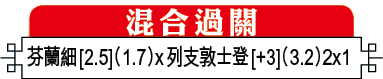 周二歐國外J組賽事上演次名爭奪戰,由第二的芬蘭主場迎戰第三的阿美尼亞,芬蘭射手迪姆普基啞火,球隊沒有其他破門板斧;阿美尼亞在羅馬中場米希達利恩因傷落選下,上場對榜尾列支敦士登只能賽和1:1,兩隊皆攻力不足,可捧「入球大細」[2.5球]的「細」。(球賽編號:星期二12;有線604台明日0:00am直播)