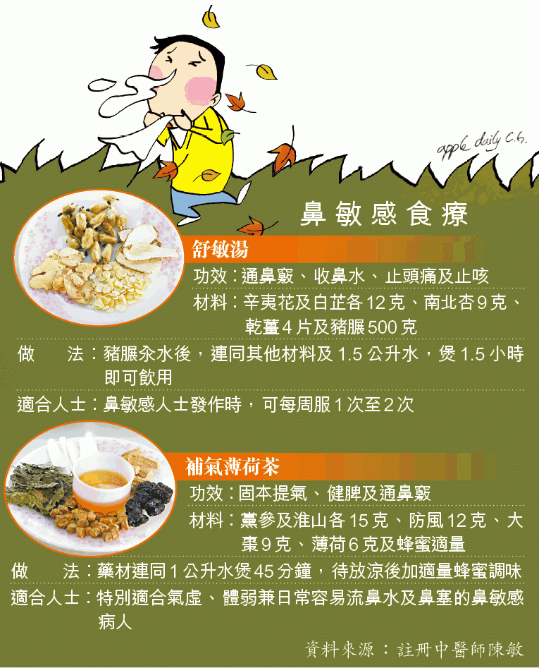 註冊中醫師陳敏表示,天氣轉變尤其入秋會較多鼻敏感求助個案。不少兒童發作初期,都被家長誤當為一般感冒處理,會經常服用傷風藥物,直至情況無改善才懷疑是鼻敏感發作。在中醫角度,鼻敏感為「鼻鼽」,指突然及反覆出現鼻炎症狀,常見症狀包括打噴嚏、鼻水多或因鼻水倒流致咳嗽及喉嚨痛,鼻痕癢、眼睛痕癢,病情嚴重更可演變成鼻竇炎。鼻敏感可與病人先天品賦不足即體質差有關,例如肺氣虛、脾氣虛或腎陽不足。鼻敏感病人多數有肺氣虛情況,即平日有唔夠氣情況,如「講嘢唔夠氣」、易攰,若後天缺乏運動鍛煉,更容易受鼻敏感、感冒等疾病所困擾。肺經虛寒都可誘發鼻敏感,意思指肺的經絡受寒,尤其入秋轉涼,令肺易受冷,包括冷氣、嗜凍飲凍食,或身體入風受寒等。