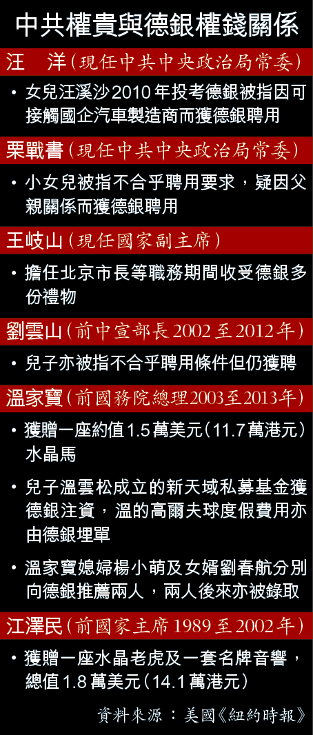 【被翻舊賬】備受關注的中共十九屆四中全會召開前夕,美國《紐約時報》及德國《南德意志報》聯手揭露,德國最大銀行德意志銀行(Deutsche Bank,下稱德銀)早年大舉進軍中國期間,曾先後向江澤民、溫家寶等時任中共高層送贈名貴禮物;德銀亦大舉延攬「官二代」,習近平心腹栗戰書的女兒、時任廣東省委書記汪洋的女兒汪溪沙亦在期間受聘。中共前任及現任高層被大翻舊賬,為四中全會投下震撼彈。