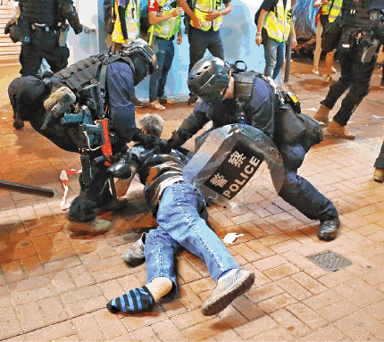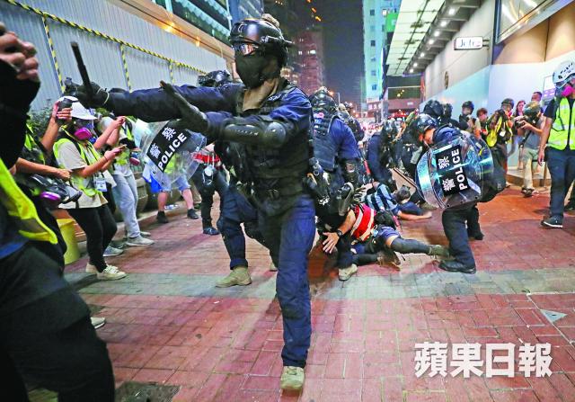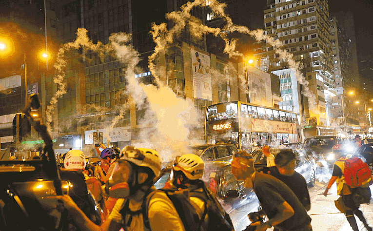 【本報訊】警察一直強調止暴制亂,卻其實是施暴製亂的源頭。大批市民昨午響應號召到尖沙嘴參與抗警暴集會,結果警方再一手引發警民衝突,然後施放多枚催淚彈,令集會甫開始即被驅散,大批市民遂流竄至多區作野貓式堵路及破壞商店,逾千名防暴警沿彌敦道相隔數米站崗嚴禁巿民走出馬路,又在多處設截查點隨處拘人,猶如白日戒嚴。入夜後群眾集結旺角抗暴,有港鐵站被縱火及有多宗「私了」事件,防暴警多次到場亂放催淚彈,現場亂上加亂,至午夜仍無力清場。