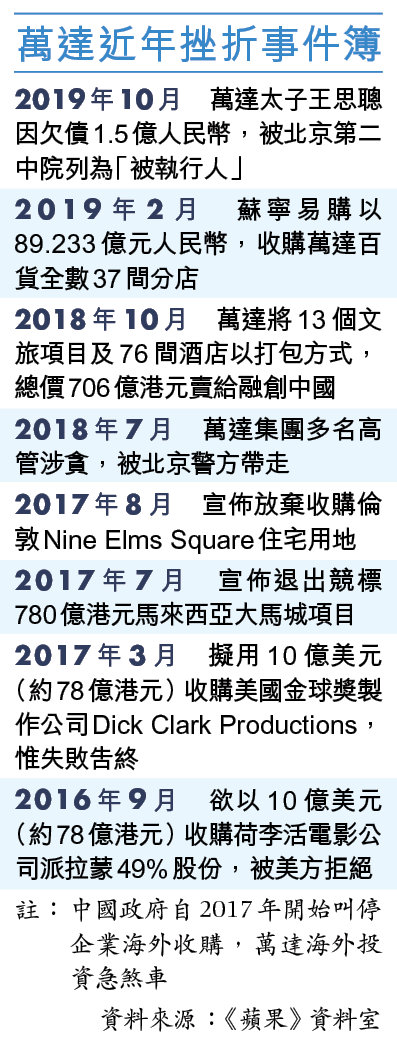 萬達在2017年前曾大力擴張海外版圖,隨內地當局收緊資本外流限制、要求排查萬達等民企後,萬達被迫放棄多個海外項目。王健林更改變業務戰略,稱將投資重點轉移國內市場。萬達大舉變賣海外資產後,目前王在海外只剩下芝加哥物業項目,在國內則重點佈局「一帶一路」文化旅遊項目等。