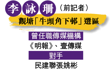 「以前都係咁,去到記者會要不停識人,其實𠵱家一樣,成個區我都要不停識所有人」。曾在《蘋果日報》實習、做過《壹週刊》投訴版,李詠珊去年離任《明報》港聞記者後,修畢香港大學法律系人權法碩士。今年7月開始落區,以素人身份出戰牛頭角下邨,與爭取連任的民建聯區議員張姚彬競逐。