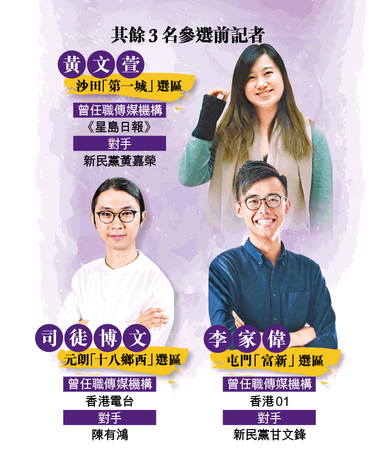 【本報訊】今屆區議會選舉,有多達五位前任和現職記者參選。現職記者的司徒港燊則走出傘運抑鬱,不再做「港豬」,出選大白田西與民建聯硬碰,勢要踢走保皇黨,「只要我哋畀心機,係有機會打得贏」。出戰牛頭角下邨的前記者李詠珊,無懼被辱罵「記者冇良心」,敢於落區與街坊論政、跟進民生議題,由阻止建制派自動當選,到今天背負街坊的期望,非勝不可,「我真係冇得輸」。