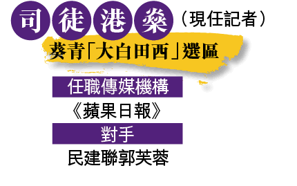 現職《蘋果日報》副刊記者的司徒港燊,出選葵青大白田西區,對手有獨立何卓威和競逐連任的民建聯郭芙蓉。