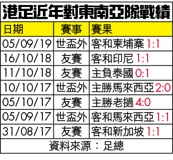 雖然港足對柬埔寨往績佔優,但近年與東南亞國家隊的國際賽,成績並不理想,上次擊敗東南亞球隊已是兩年前,且看今晚再對柬埔寨能否取得兩年來首勝東南亞隊。