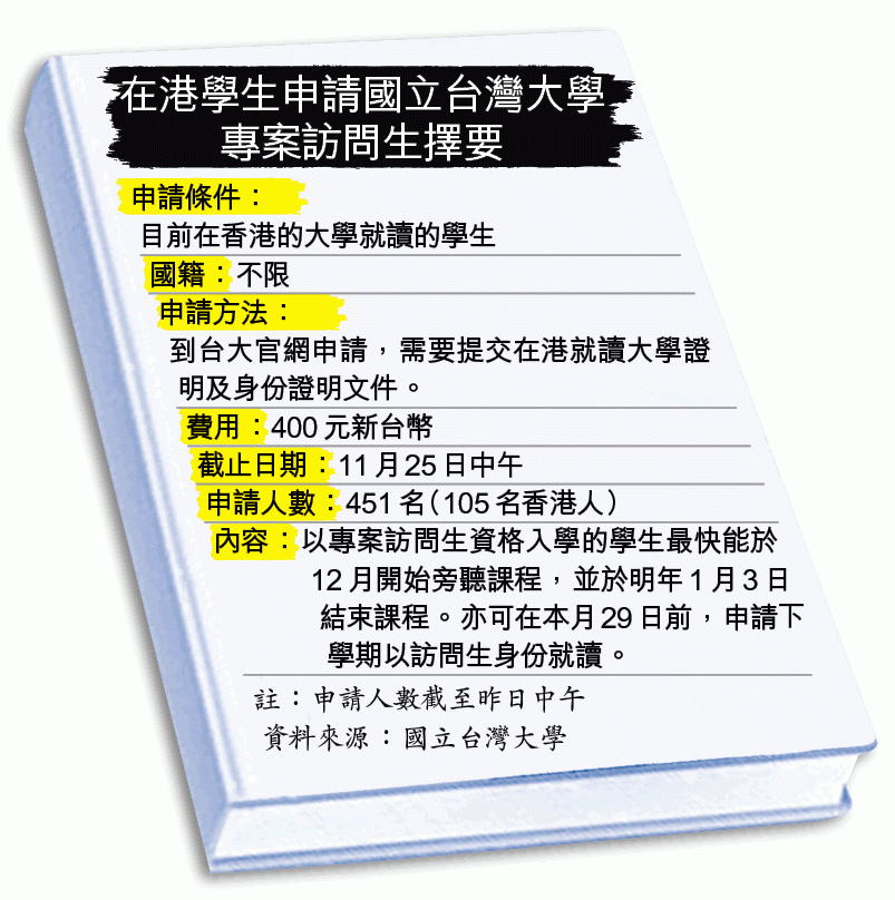 台灣教育部上周宣佈啟動重大災害地區學生升學優待辦法,協助在港台生回台就讀後,台灣多間大學近日陸續主動表明,歡迎香港的大學學生。根據台大官網昨日更新的聲明,會以專案訪問生的方式,接收香港各大學的學生前往就讀,而申請成功的人最快將在下月初開始旁聽課堂,並於明年1月3日結束,亦無法獲得學分;若果下學期繼續以訪問生身份就讀,則可在本月29日前另作申請。